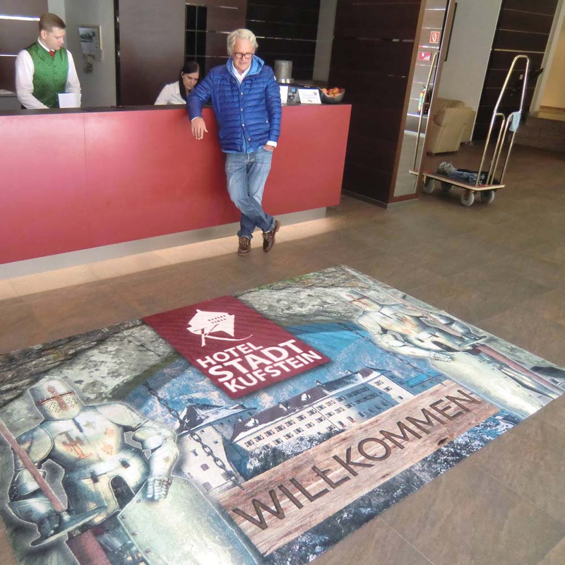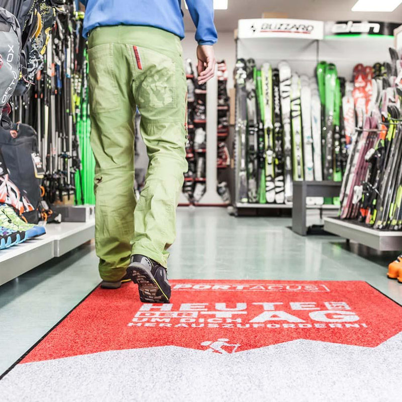 Eine Schmutzfangmatte mit eigenem Logo ist eine Visitenkarte vor Ihrem Geschäft und lässt sich mit Hilfe unserem Konfigurator von Ihnen individuell gestalten. Selbstverständlich lässt sich je nach Firma und örtlicher Gegebenheit eine solche Fussmatte auch im Innenbereich als bedruckte Logomatte verwenden. Wir beraten Sie gerne, welche Art von Matte bzw. Schmutzfangmatte als Werbemittel für Ihre Zwecke die geeignete ist.