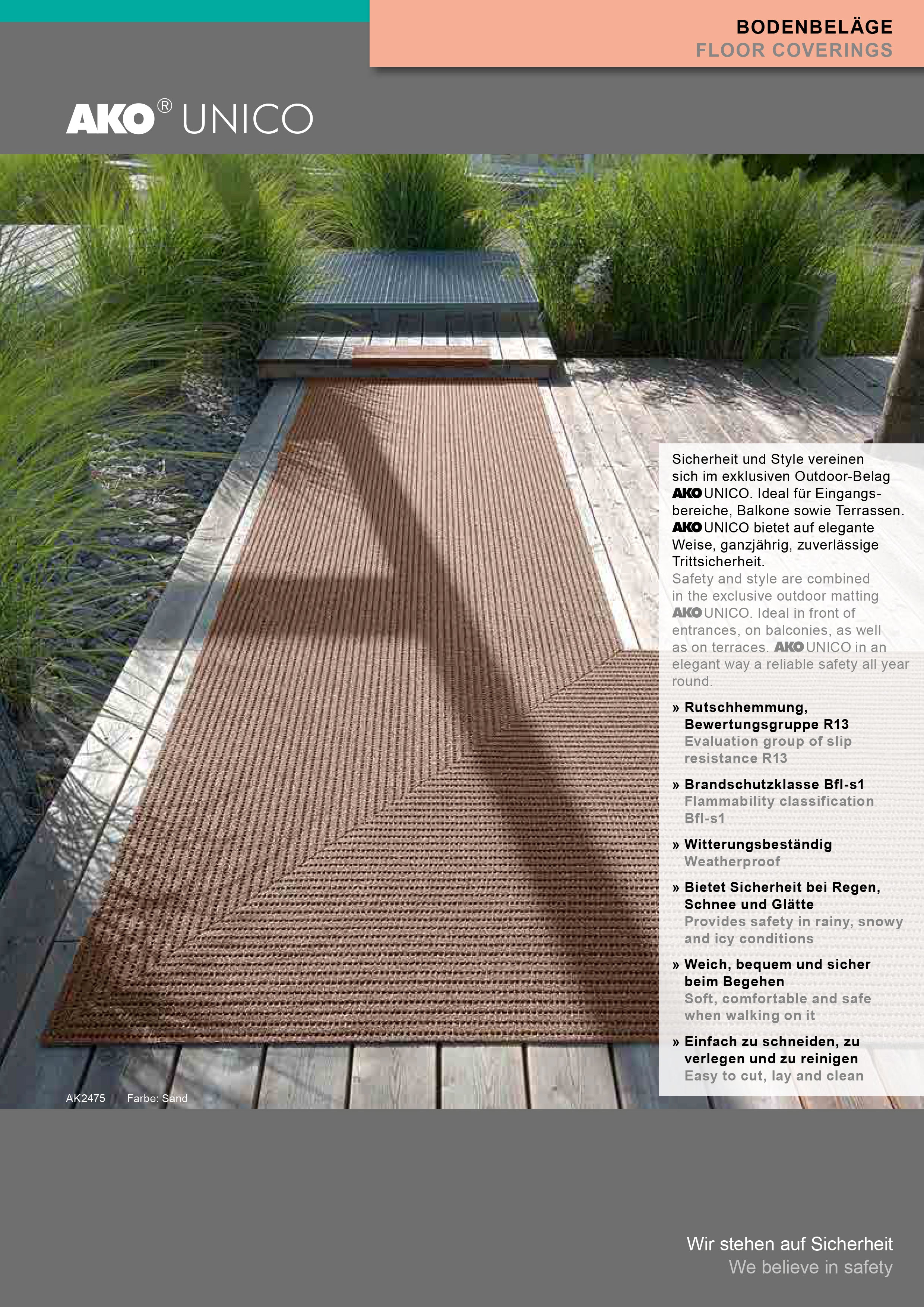 - Die AKO Sicherheitsmatte wurden speziell für Außenbereiche entwickelt: Rutschsicher (R13) - Gegen Wasser, Kälte und Wärme unempfindlich - Dünne Eisschicht zerbricht beim Auftreten, Rutschsicherheit bleibt bestehen - Verrottungsfest und UV-Beständig - Einfach zu schneiden, zu verlegen und zu reinigen