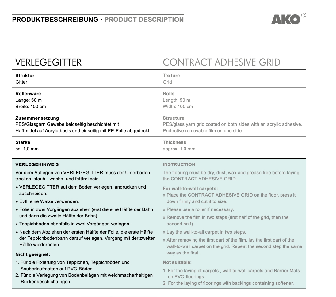 AKO VERLEGEGITTER Für das kurz- und mittelfristige Verlegen von Teppichböden und Teppichfliesen