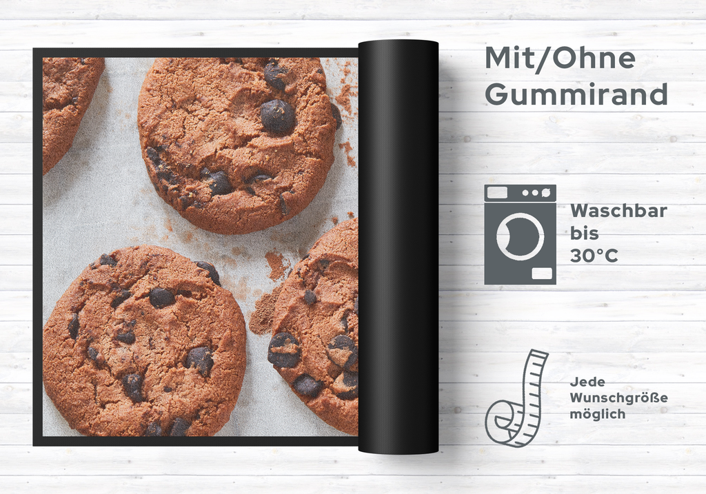 Mit dieser Fußmatte Cookies 10237 zaubern Sie nicht nur Ihren Besuchern ein Lächeln ins Gesicht. Diese sehr hochwertige Türmatte ist reissfest, knitterfrei, waschbar. Da sie mit 7 mm Gesamthöhe sehr flach ist, passt sie unter fast jede Tür. Die Fußmatte ist Schadstoffgeprüft und für Allergiker geeignet. Sie erhalten 5 Jahre Herstellergarantie.