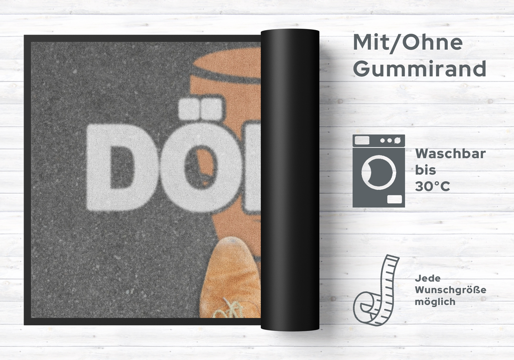 Mit dieser Fussmatte Döner 5060 zaubern Sie nicht nur Ihren Besuchern ein Lächeln ins Gesicht. Diese sehr hochwertige Türmatte ist reissfest, knitterfrei, waschbar. Da sie mit 7 mm Gesamthöhe sehr flach ist, passt sie unter fast jede Tür. Die Fussmatte ist Schadstoffgeprüft und für Allergiker geeignet. Sie erhalten 5 Jahre Herstellergarantie.