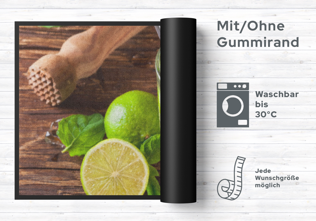 Mit dieser Fussmatte Cocktail 5036 zaubern Sie nicht nur Ihren Besuchern ein Lächeln ins Gesicht. Diese sehr hochwertige Türmatte ist reissfest, knitterfrei, waschbar. Da sie mit 7 mm Gesamthöhe sehr flach ist, passt sie unter fast jede Tür. Die Fussmatte ist Schadstoffgeprüft und für Allergiker geeignet. Sie erhalten 5 Jahre Herstellergarantie.