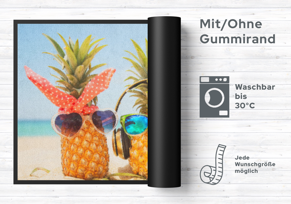 Mit dieser Fussmatte Ananas 6354 zaubern Sie nicht nur Ihren Besuchern ein Lächeln ins Gesicht. Diese sehr hochwertige Fussmatte ist reissfest, knitterfrei, waschbar. Da sie mit 7-8 mm Gesamthöhe sehr flach ist, passt sie unter fast jede Tür. Die Fussmatte ist Schadstoffgeprüft und für Allergiker geeignet. Sie erhalten 5 Jahre Herstellergarantie.