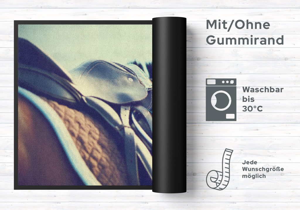 Pflegeinfo: Waschen Sie die Fussmatte Pferd 6264 separat bei 40° Temperatur mit Feinwaschmittel, schleudern diese auf niedriger Stufe, dadurch richten sich die Fasern auf, der Mattenflor wird aktiviert und transportbedingte Falten und Knicke werden wieder glatt. Pflegen Sie so Ihre Fussmatte regelmäßig und Sie werden überrascht sein, wie viele Jahre Qualität und Farbe erhalten bleiben.