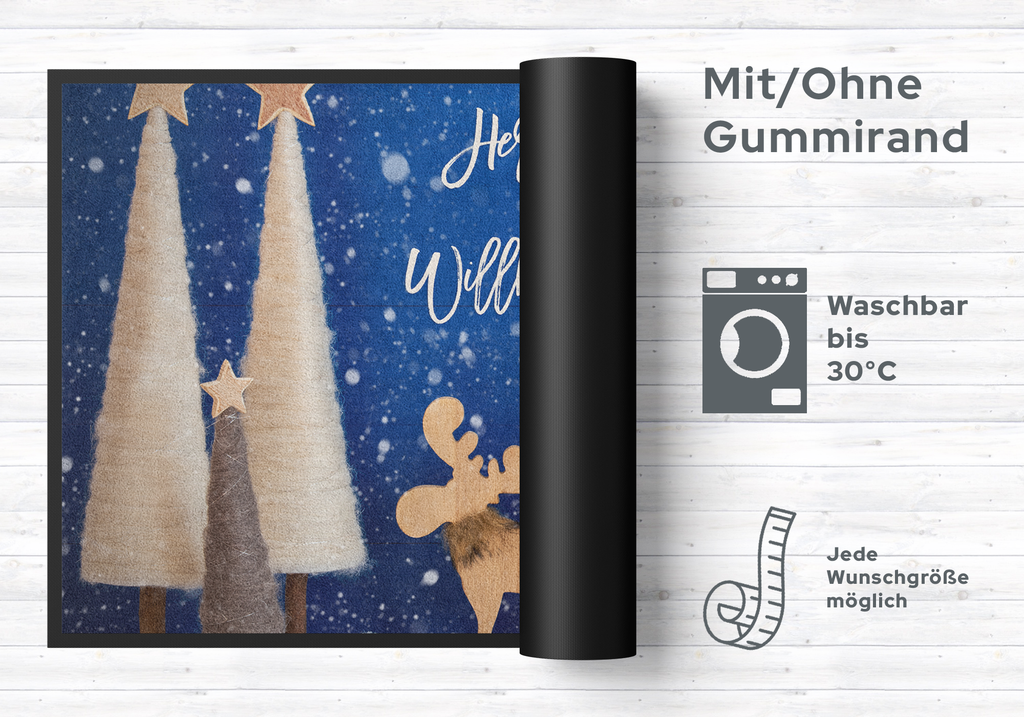 Mit dieser Fussmatte Herzlich Willkommen Weihnachten 10298 zaubern Sie nicht nur Ihren Besuchern ein Lächeln ins Gesicht. Diese sehr hochwertige Türmatte ist reissfest, knitterfrei, waschbar. Da sie mit 7 mm Gesamthöhe sehr flach ist, passt sie unter fast jede Tür. Die Fussmatte ist Schadstoffgeprüft und für Allergiker geeignet. Sie erhalten 5 Jahre Herstellergarantie.